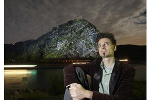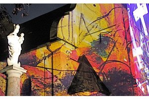 Die im Workshop am Vortag entstandenen Lichtbilder werden auf die Fassade der katholischen Pfarrkirche projiziert – ein poetisch-fröhliches, frühabendliches Silvestererlebnis für Kinder, Familien und Gäste.